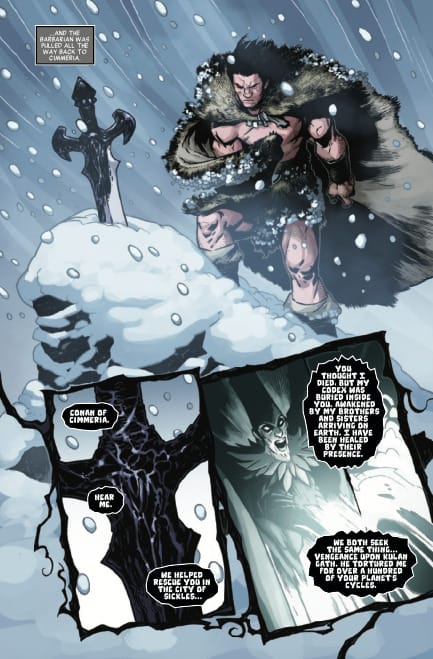 The Barbarian is then brought back to Cimmeria as he looks upon a sword. He is spoken to by a spirit within the weapon. It once knew Conan and he had believed it died. Yet, their brothers and sister helped bring them back. Even the spirit’s codex was embedded into Conan. The spirit called on the Barbarian to grant him the weapon needed to kill Kulan Gath. Refusing the offer would mean certain death to the warrior. As for Flyer and Deadpool, they continue fighting off the dragons.